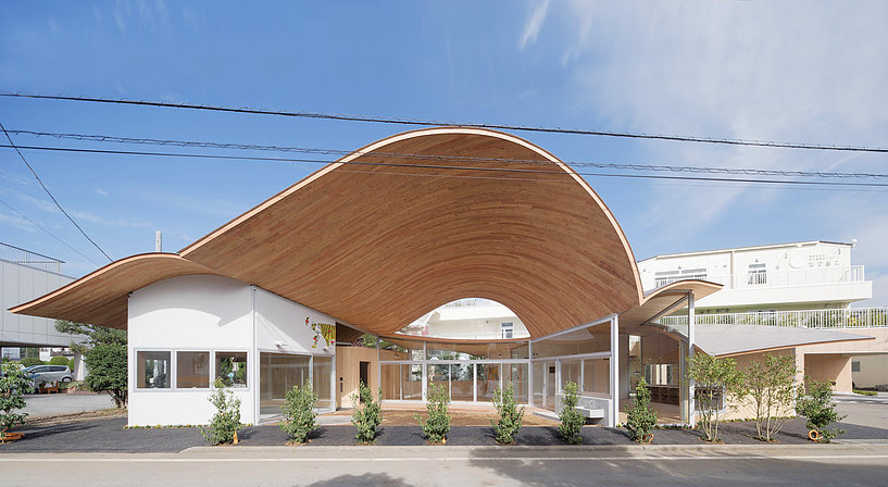在日本距離富士山不會遠名為山梨縣的一個寧靜的小鎮(zhèn),幼兒園方面邀請了tyo建筑事務(wù)所的設(shè)計師進行幼兒園,設(shè)計師在實地考察深入分析之后設(shè)計了一個很有特點的大波浪屋頂?shù)挠變簣@,在幼兒園設(shè)計之初除了是要滿足當?shù)氐挠變哼M學的需求之外,還要起到一個社區(qū)聚集場所的功能,建筑師想將其打造成“村口大樹”的感覺。