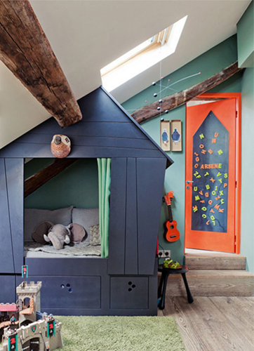 在兒童房里搭建一個(gè)小小的木屋,木質(zhì)的地板再碰上綠色如同綠草一般的柔軟地毯,讓孩子在房間里能體會(huì)到室外的感覺,而且屋中屋的設(shè)計(jì)也會(huì)很受孩子的歡迎也會(huì)給孩子更多的空間安全感。